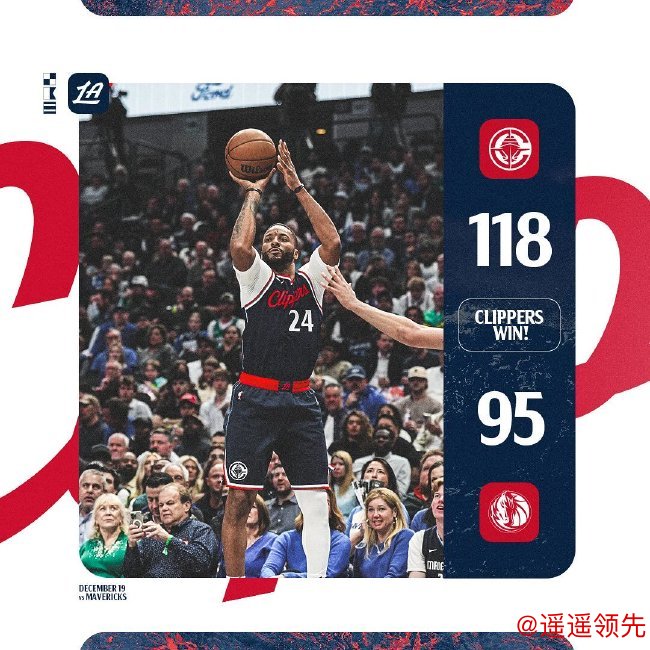 快船3人20+轻松取得大胜,2连胜后16胜12负排在西部第六。