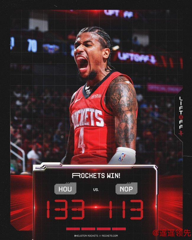 火箭(18-9):杰伦-格林34分6篮板3助攻、狄龙26分7篮板、申京23分9篮板7助攻、史密斯15分5助攻、范弗里特13分9助攻、阿隆-霍勒迪10分3篮板